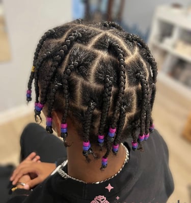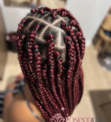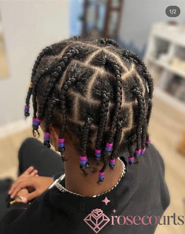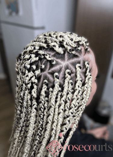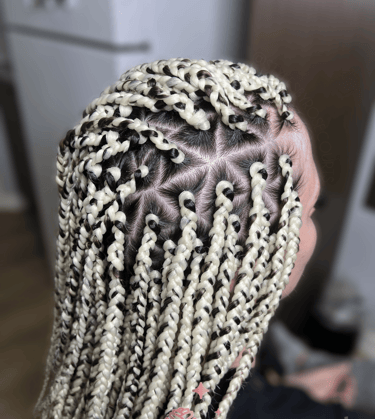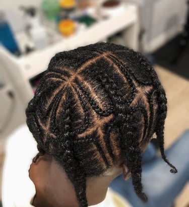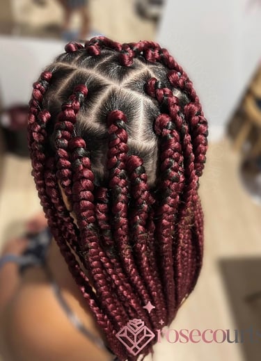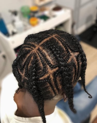 The art of sectioning hair into precisely shaped squares(boxes) or triangular parts all throughout the scalp and braiding the hair down its entire length.
