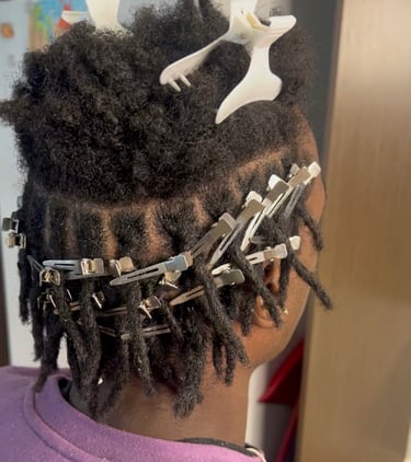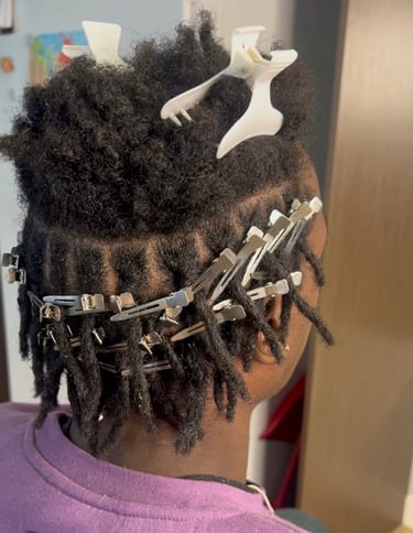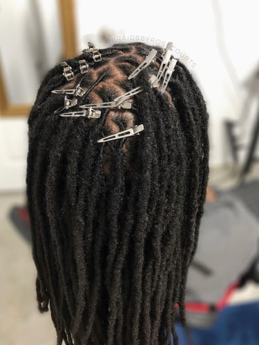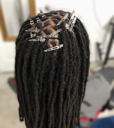 Carefully regathering any new growth or strands of hair from the root and either crocheting, interlocking or twisting them together to retighten the loc and keep it growing in its correct form. This can also include tightening or repairing already established locs.